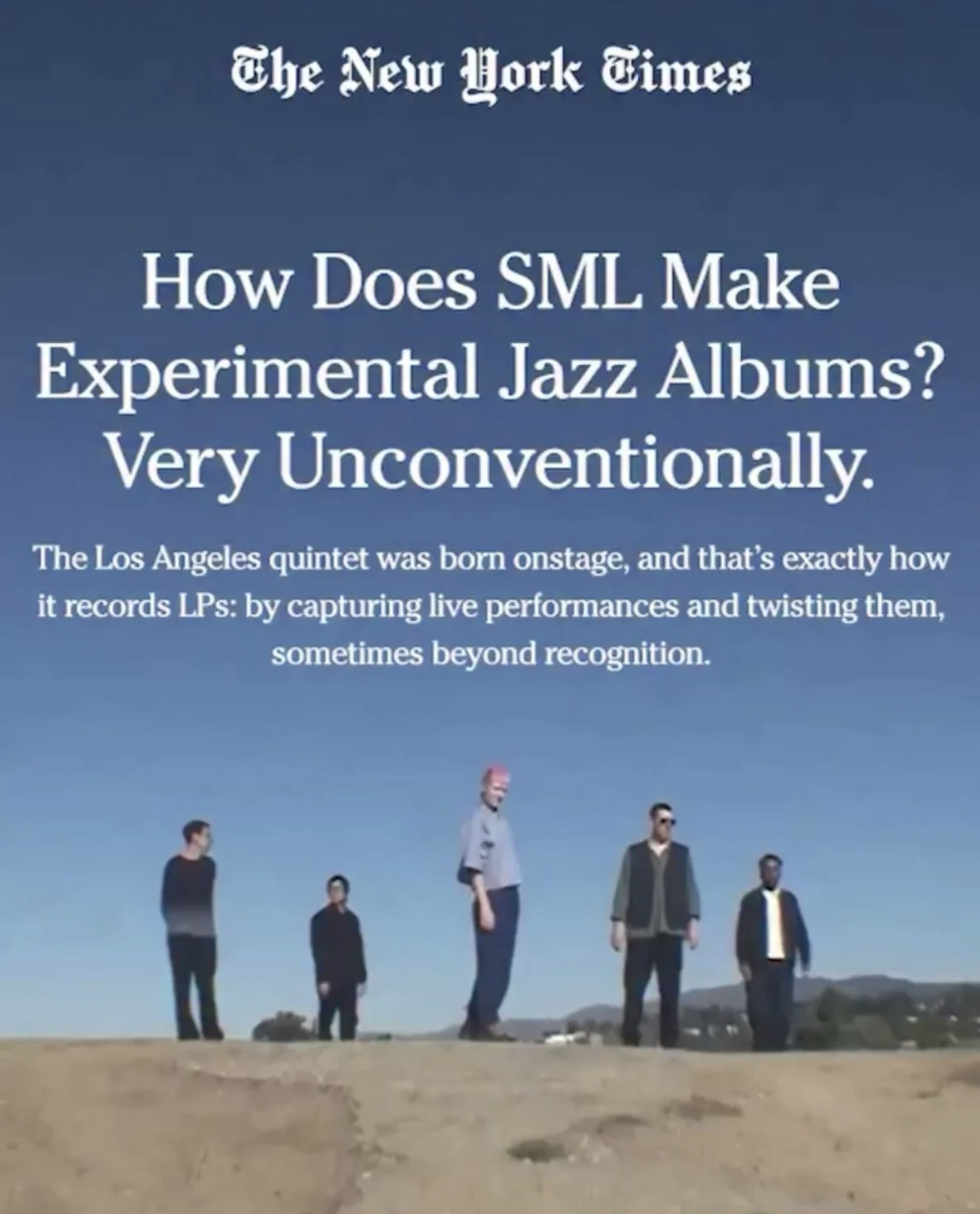 SML is a new quintet composed of luminaries from Los Angeles’s thriving jazz, improvised, and indie music scenes: bassist Anna Butterss (Jason Isbell, Phoebe Bridgers, Makaya McCraven, Daniel Villarreal), synthesist Jeremiah Chiu (Ariel Kalma, Marta Sofia Honer, Icy Demons), saxophonist Josh Johnson (Meshell Ndegeocello, Leon Bridges, Carlos Niño), percussionist Booker Stardrum (Amirtha Kidambi, Lisel, Lee Ranaldo, Patrick Shiroishi) and guitarist Gregory Uhlmann (Sam Wilkes, Meg Duffy, Perfume Genius).